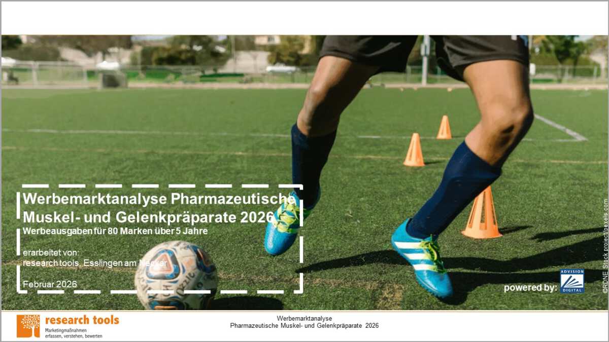 Die Studie gibt Einblick in Trends, Benchmarks und Strategien der werbungtreibenden Anbieter von pharmazeutischen Muskel- und Gelenkpräparaten in Deutschland. Sie zeigt quantitative Fünf-Jahres-Trends für 90 Marken auf und ermöglicht einen unmittelbaren Wettbewerbsvergleich. Für zehn Top-Marken visualisiert neben einer zeitlichen Werbedruckverteilung nach Mediengattungen eine statistische Kommunikationspositionierung auf Basis Jahreszeiten und Mediensplit die Allokation der Budgets. Datenbasis ist die Werbedatenbank des Werbemonitorers AdVision digital, Hamburg.
