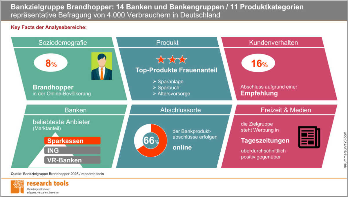 Brandhopper sind häufiger männlich, über 45 Jahre alt, gebildet und verfügen über ein überdurchschnittliches Einkommen. Sie agieren informiert, zeigen eine hohe Wechselbereitschaft und entscheiden sich vor allem dann für einen Abschluss, wenn attraktive Konditionen oder eine gute Sichtbarkeit in Vergleichsportalen gegeben sind. Bankprodukte werden von ihnen nur selten in der Filiale, dafür zu 66 Prozent online abgeschlossen. Besonders beliebt sind Kreditkarten, Tagesgeldkonten und Wertpapiere, die bevorzugt bei alternativen Banken außerhalb der klassischen Institute genutzt werden.