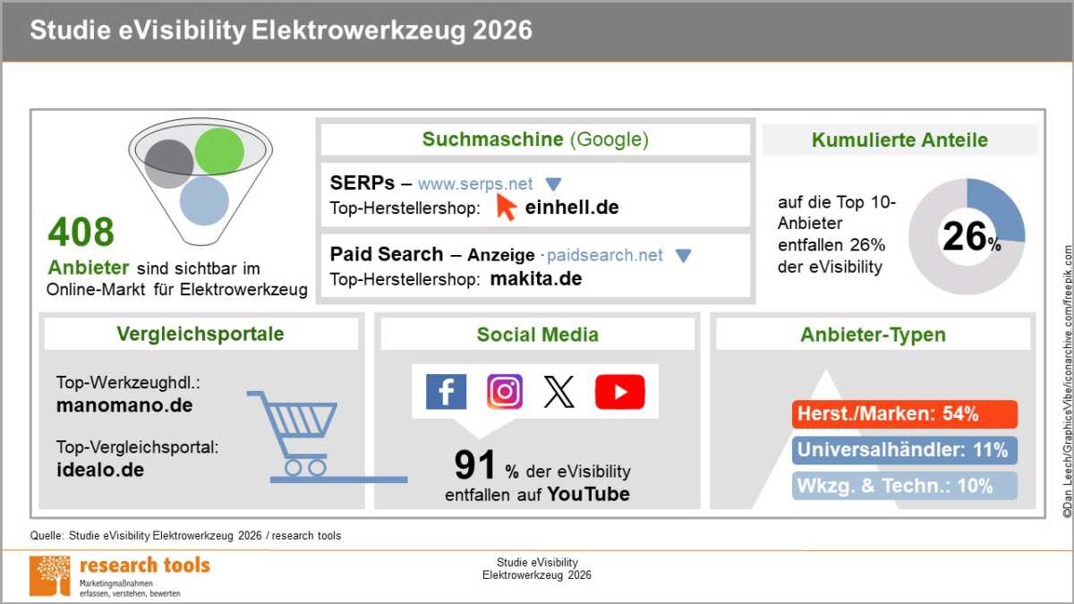Die Studie gibt Einblick in die Internetsichtbarkeit der Anbieter von Elektrowerkzeug und analysiert die Onlinepräsenz der 100 Unternehmen mit der größten eVisibility in den fünf Onlinekategorien organische Suchmaschinenergebnisse, Paid Search, Vergleichsportale, Social Media und Plattform Amazon. Zudem zeigt sie die Gesamtränge aller 408 Anbieter.