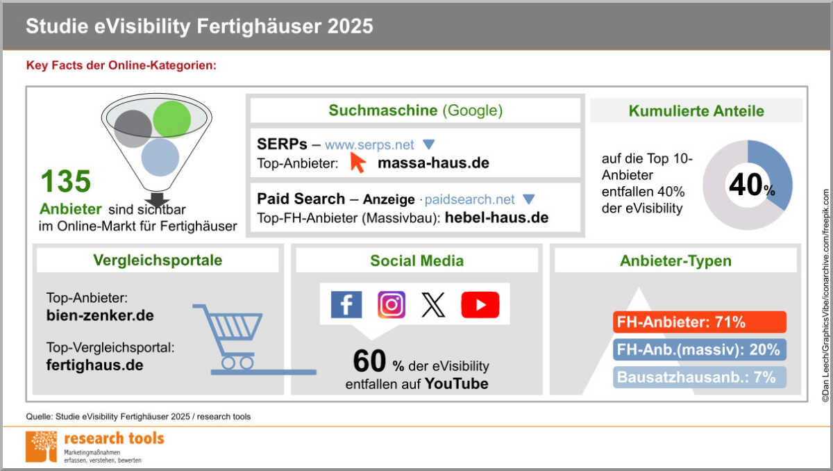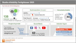 Die Studie gibt Einblick in die Internetsichtbarkeit der Anbieter von Fertighäusern und analysiert die Onlinepräsenz der 100 Unternehmen mit der größten eVisibility in den vier Onlinekategorien organische Suchmaschinenergebnisse, Paid Search, Vergleichsportale und Social Media. Zudem zeigt sie die Gesamtränge aller 135 Anbieter.