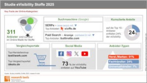 Die Studie gibt Einblick in die Sichtbarkeit der Anbieter von Stoffen im Internet und analysiert die Onlinepräsenz der 100 Unternehmen mit der größten eVisibility in den fünf Onlinekategorien organische Suchmaschinenergebnisse, Paid Search, Vergleichsportale, Social Media und Plattform Amazon. Zudem zeigt sie die Gesamtränge aller 311 Anbieter.