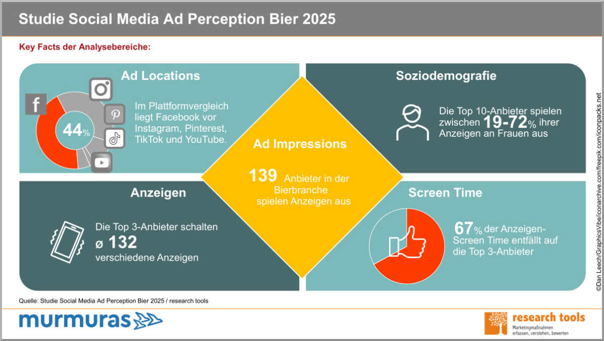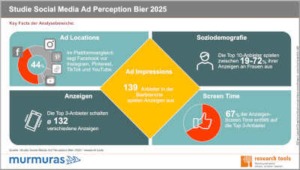 Die Studie analysiert die Ad Perception der Anbieter von Energieprodukten auf den Plattformen Facebook, Instagram, Pinterest, TikTok und YouTube. Dabei wird die Anzeigenwahrnehmung nach verschiedenen Kategorien wie Anzeigeninhalte und Screen Time differenziert, um daraus Benchmarks abzuleiten. Der Wettbewerbsvergleich verdeutlicht die Unterschiede der Anzeigenausspielung nach Ad Location sowie Geschlecht und Alter. Eine statistische Social Media-Positionierung visualisiert die Ergebnisse der Top 10-Anbieter. Die Daten stammen vom Co-Herausgeber Murmuras GmbH, der mittels App die Anzeigenwahrnehmung in den Social Media erfasst.