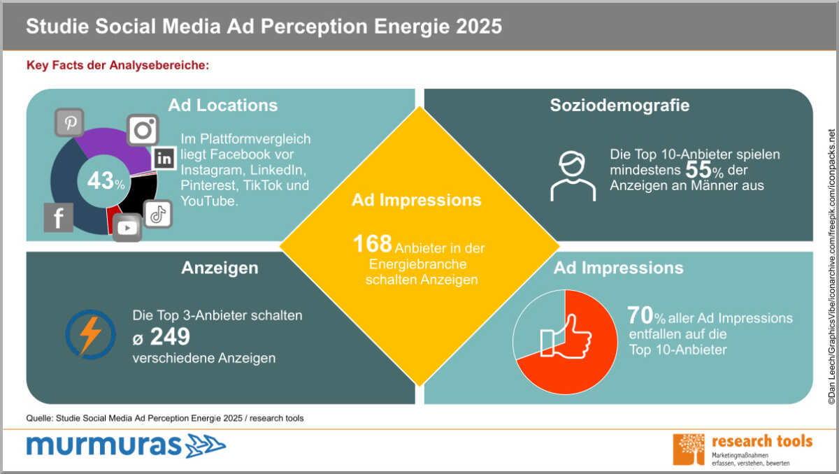 Die Studie analysiert die Ad Perception der Anbieter von Energieprodukten auf den Plattformen Facebook, Instagram, LinkedIn, Pinterest, TikTok und YouTube. Dabei wird die Anzeigenwahrnehmung nach verschiedenen Kategorien wie Anzeigeninhalte und Screen Time differenziert, um daraus Benchmarks abzuleiten. Der Wettbewerbsvergleich verdeutlicht die Unterschiede der Anzeigenausspielung nach Ad Location sowie Geschlecht und Alter. Eine statistische Social Media-Positionierung visualisiert die Ergebnisse der Top 10-Anbieter. Die Daten stammen vom Co-Herausgeber Murmuras GmbH, der mittels App die Anzeigenwahrnehmung in den Social Media erfasst.