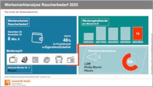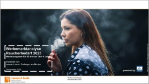 Die Studie gibt Einblick in Trends, Benchmarks und Strategien der werbungtreibenden Anbieter von Raucherbedarf in Deutschland. Sie präsentiert quantitative Fünf-Jahres-Trends für 50 Marken und ermöglicht einen direkten Vergleich mit anderen Akteuren auf dem Markt. Ergänzend zur zeitlichen Verteilung der Werbeaktivitäten nach Mediengattungen bietet die Studie eine statistische Analyse der Kommunikationsstrategien basierend auf Jahreszeiten und Mediennutzung sowie Entwicklungen in neun Produktmärkten. Für die zehn führenden Marken werden Budgetallokationen visualisiert. Datenbasis ist die Werbedatenbank des Werbemonitorers AdVision digital, Hamburg.