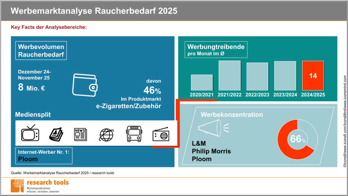 Die Studie gibt Einblick in Trends, Benchmarks und Strategien der werbungtreibenden Anbieter von Raucherbedarf in Deutschland. Sie präsentiert quantitative Fünf-Jahres-Trends für 50 Marken und ermöglicht einen direkten Vergleich mit anderen Akteuren auf dem Markt. Ergänzend zur zeitlichen Verteilung der Werbeaktivitäten nach Mediengattungen bietet die Studie eine statistische Analyse der Kommunikationsstrategien basierend auf Jahreszeiten und Mediennutzung sowie Entwicklungen in neun Produktmärkten. Für die zehn führenden Marken werden Budgetallokationen visualisiert. Datenbasis ist die Werbedatenbank des Werbemonitorers AdVision digital, Hamburg.
