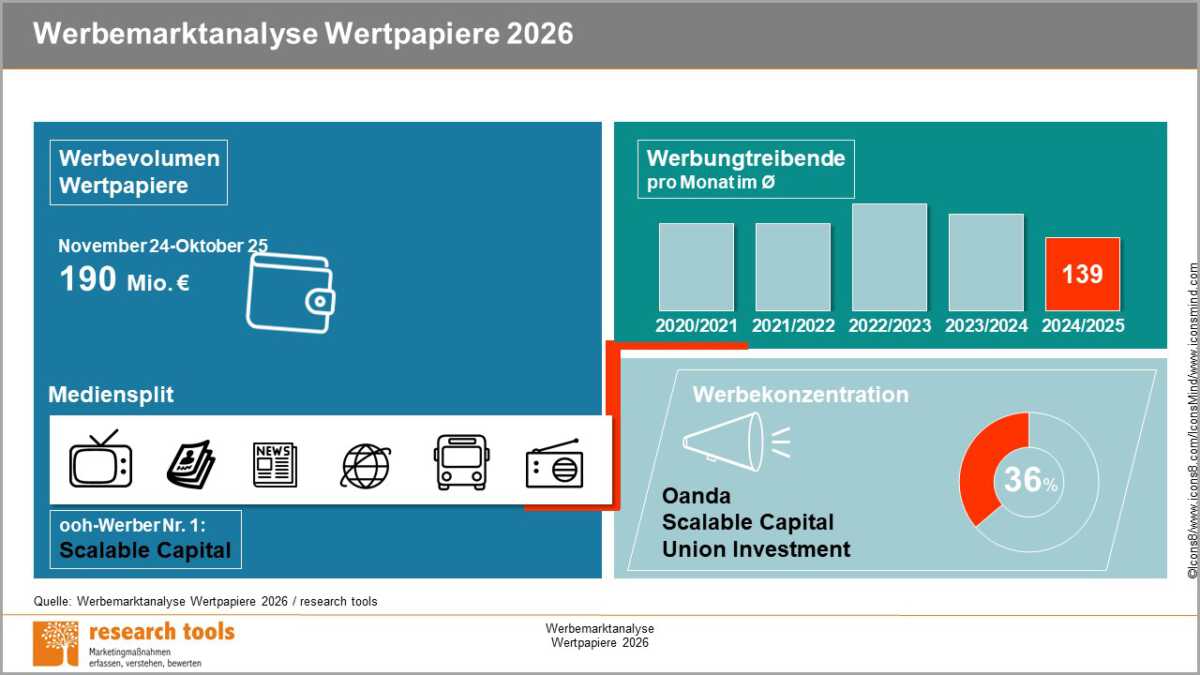 Im Zeitraum von November 2024 bis Oktober 2025 investierten 400 Banken und Wertpapiermarken 190 Millionen Euro in mediale Kommunikation. Die Zahl der monatlich werbenden Marken ging auf 139 zurück und liegt damit unter dem Niveau der vorangegangenen zwei Jahre. Deutlich stärker fallen die saisonalen Unterschiede ins Gewicht: In November und Dezember sind überdurchschnittliche Ausgaben zu beobachten. Internet (Internetbanner und YouTube-Werbevideos) ist das dominierende Medium. Auf die drei werbestärksten Marken entfallen zusammen 36 Prozent der gesamten Investitionen.